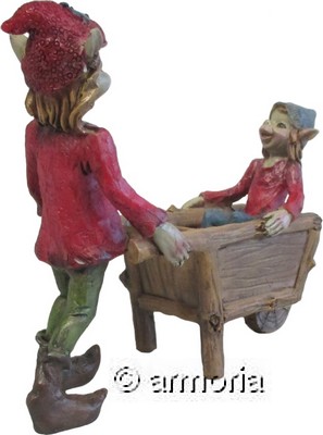 Originale figurine en résine représentant un papa pixie avec son enfant dans une brouette.