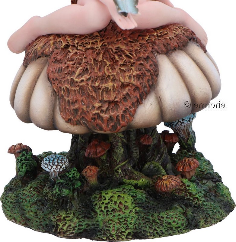 Très belle figurine d'une fée assise sur un champignon, un papillon sur la main